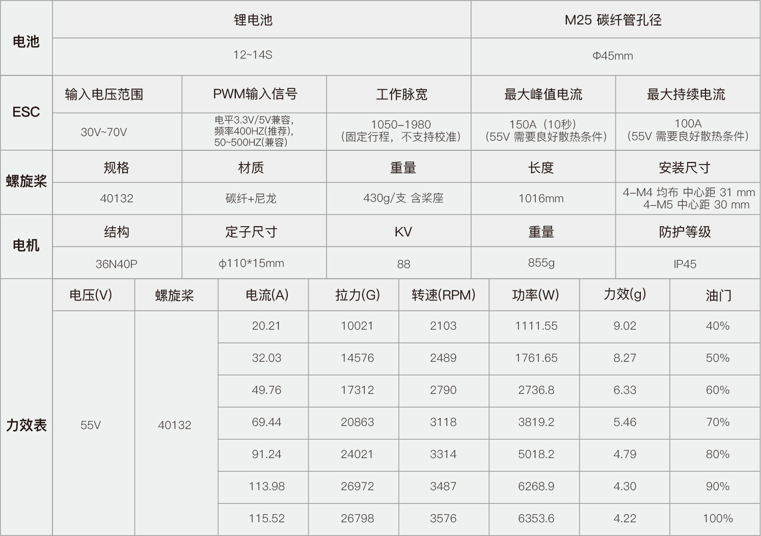 WK-M25动力系统采用高度模块化的集成设计,将电机、电调、桨叶、碳纤管及电机座整合为一套即插即用的解决方案。其维护与拆装极为便捷,并可兼容38至42英寸的折叠桨叶,有效提升飞行能效。