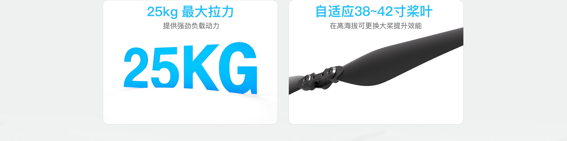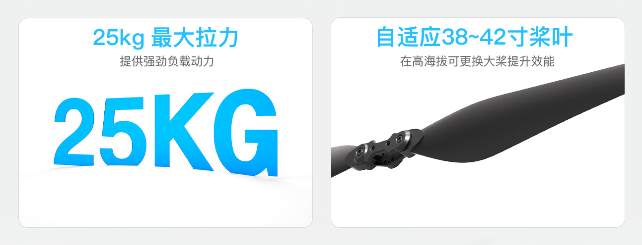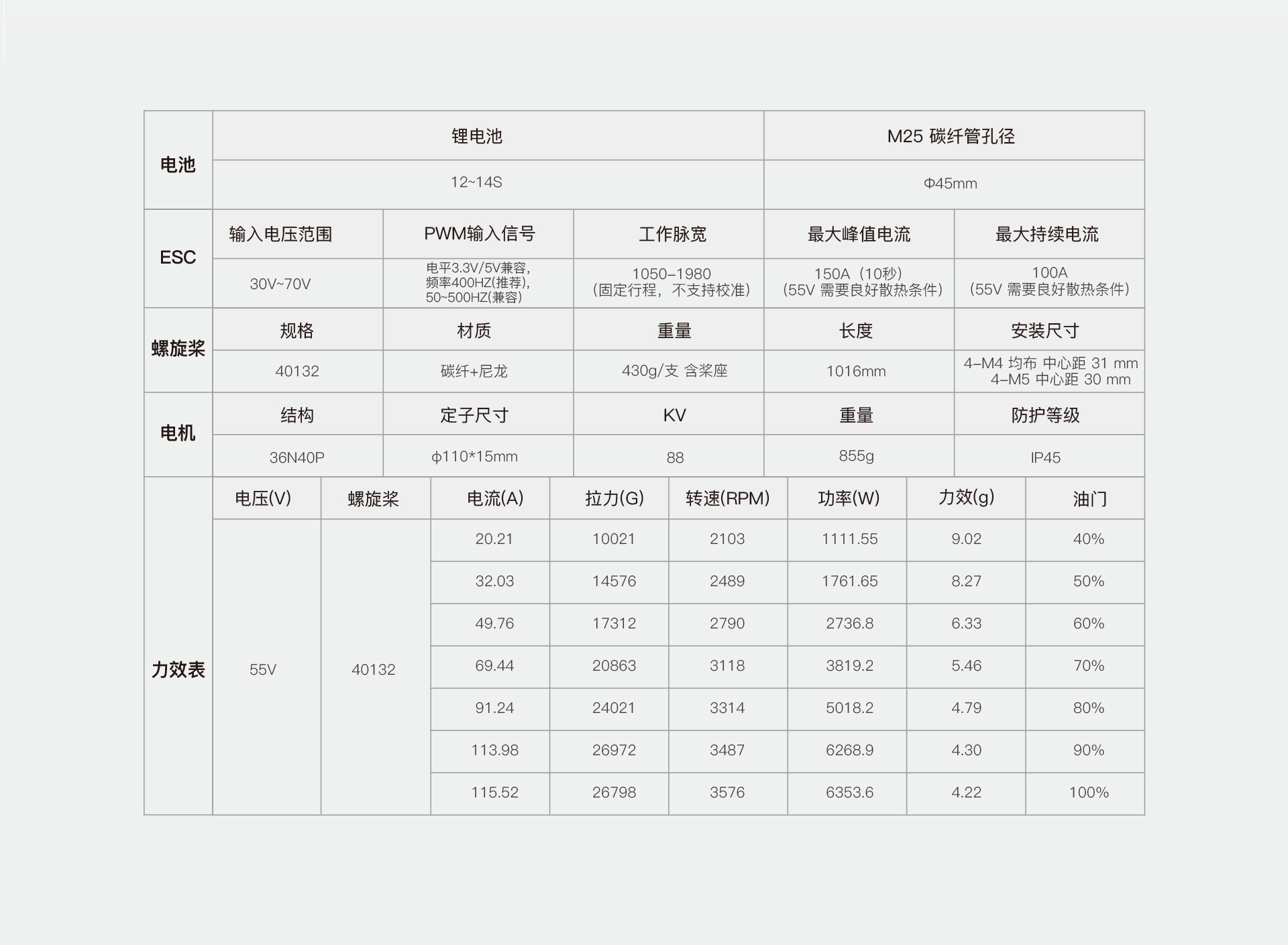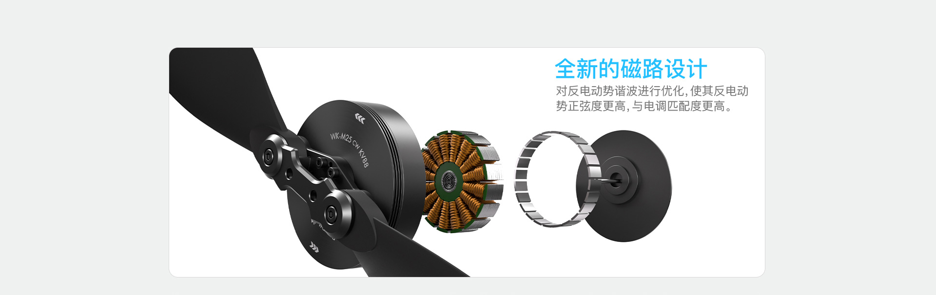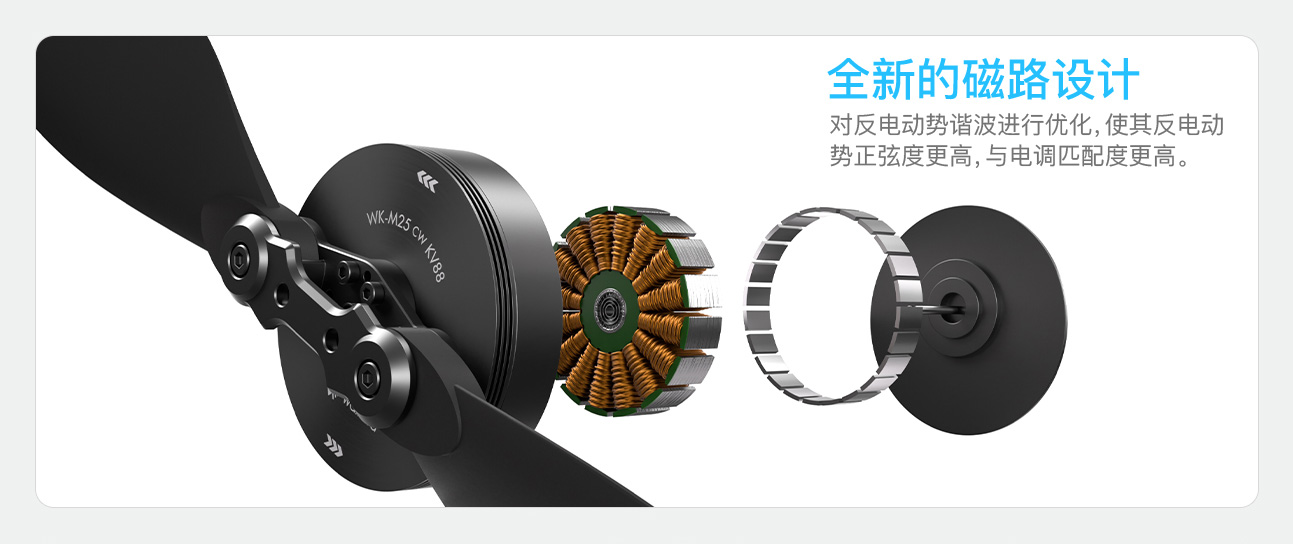 WK-M25动力系统采用高度模块化的集成设计,将电机、电调、桨叶、碳纤管及电机座整合为一套即插即用的解决方案。其维护与拆装极为便捷,并可兼容38至42英寸的折叠桨叶,有效提升飞行能效。