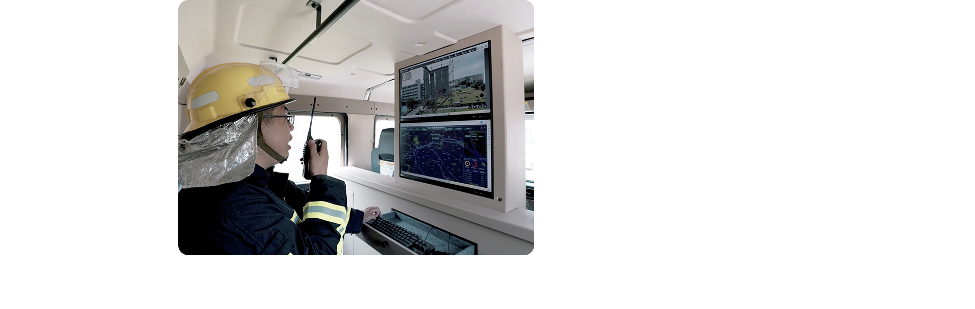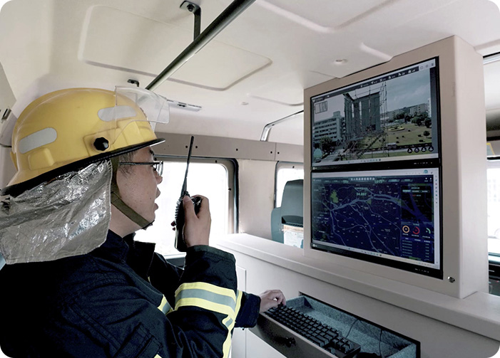 消防车上配有多屏多画面监控指挥平台,能够实时监控无人机画面、起飞平台和消防车周围情况,通过5G网络通信设备,可将现场数据实时回传至总部指挥中心。