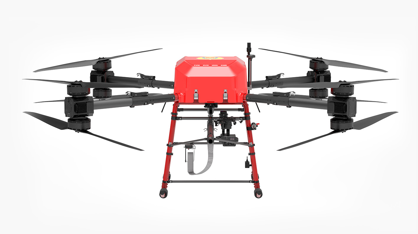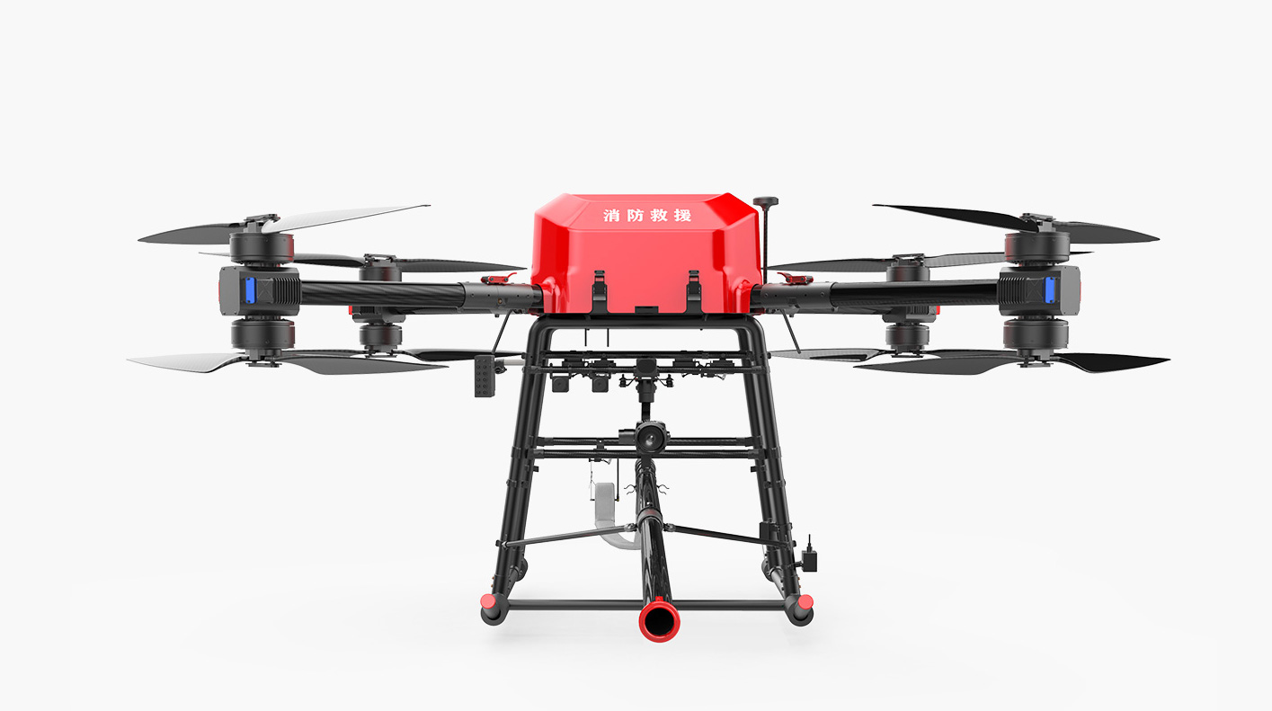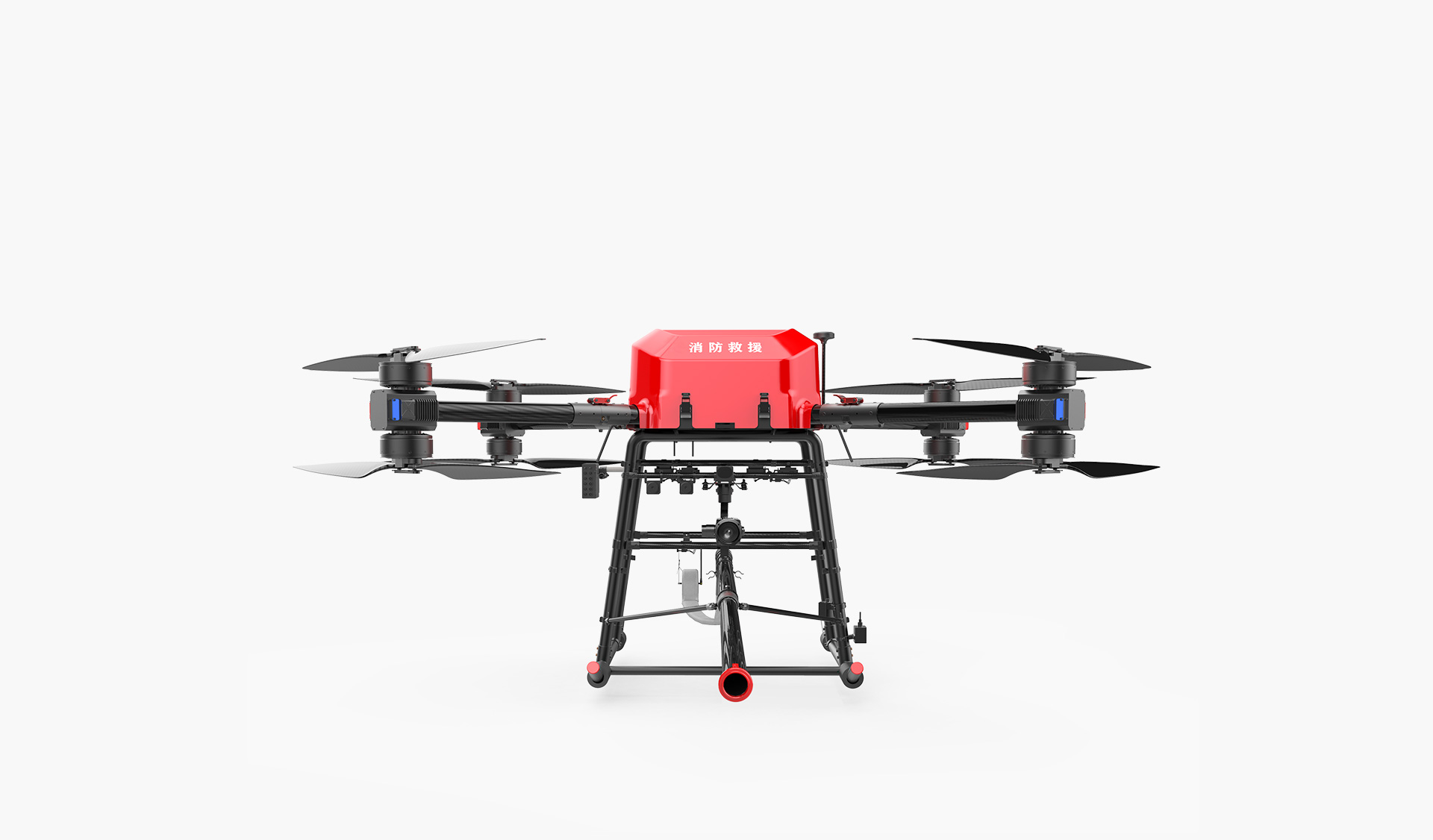 四轴消防灭火无人机,载重量大、抗风能力强、抛撒精度高,可以近距离喷洒灭火干粉。最大负载可达60KG,空载飞行时间可达60分钟。支持挂载多种装配,包括30倍变焦相机、干粉灭火罐、抛投灭火弹、喷水灭火、探照灯、喊话器等。