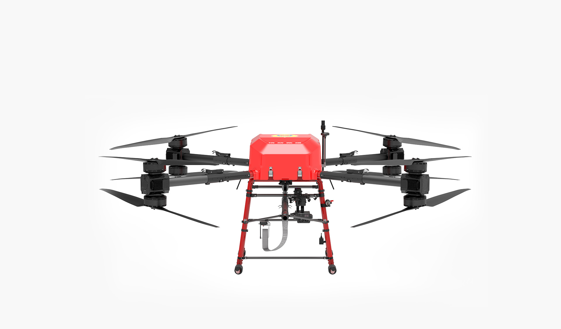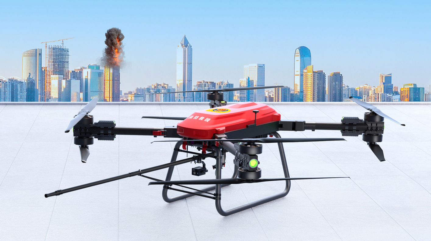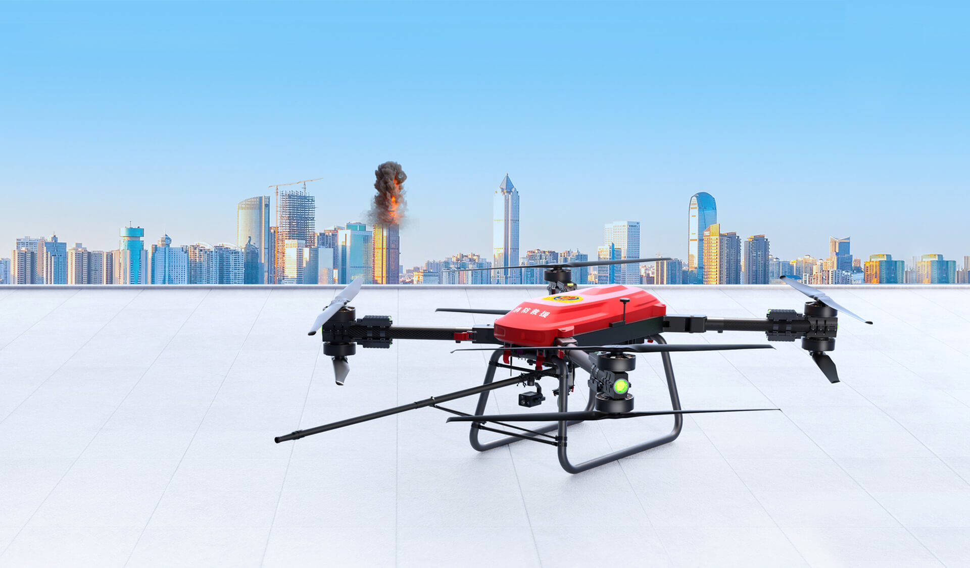 四轴消防灭火无人机,载重量大、抗风能力强、抛撒精度高,可以近距离喷洒灭火干粉。最大负载可达60KG,空载飞行时间可达60分钟。支持挂载多种装配,包括30倍变焦相机、干粉灭火罐、抛投灭火弹、喷水灭火、探照灯、喊话器等。